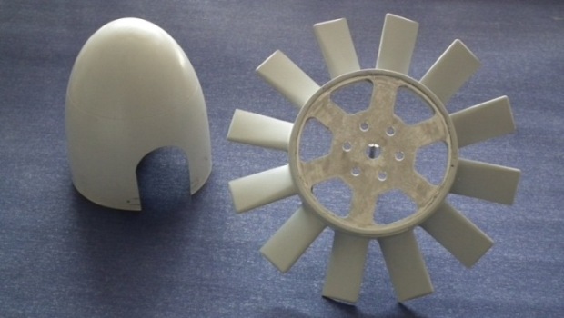 Das Lüfterrad besteht aus einer 3 mm Aluminium Grundplatte und hat 12 profilierte Lüfterschauffeln aus Gfk.